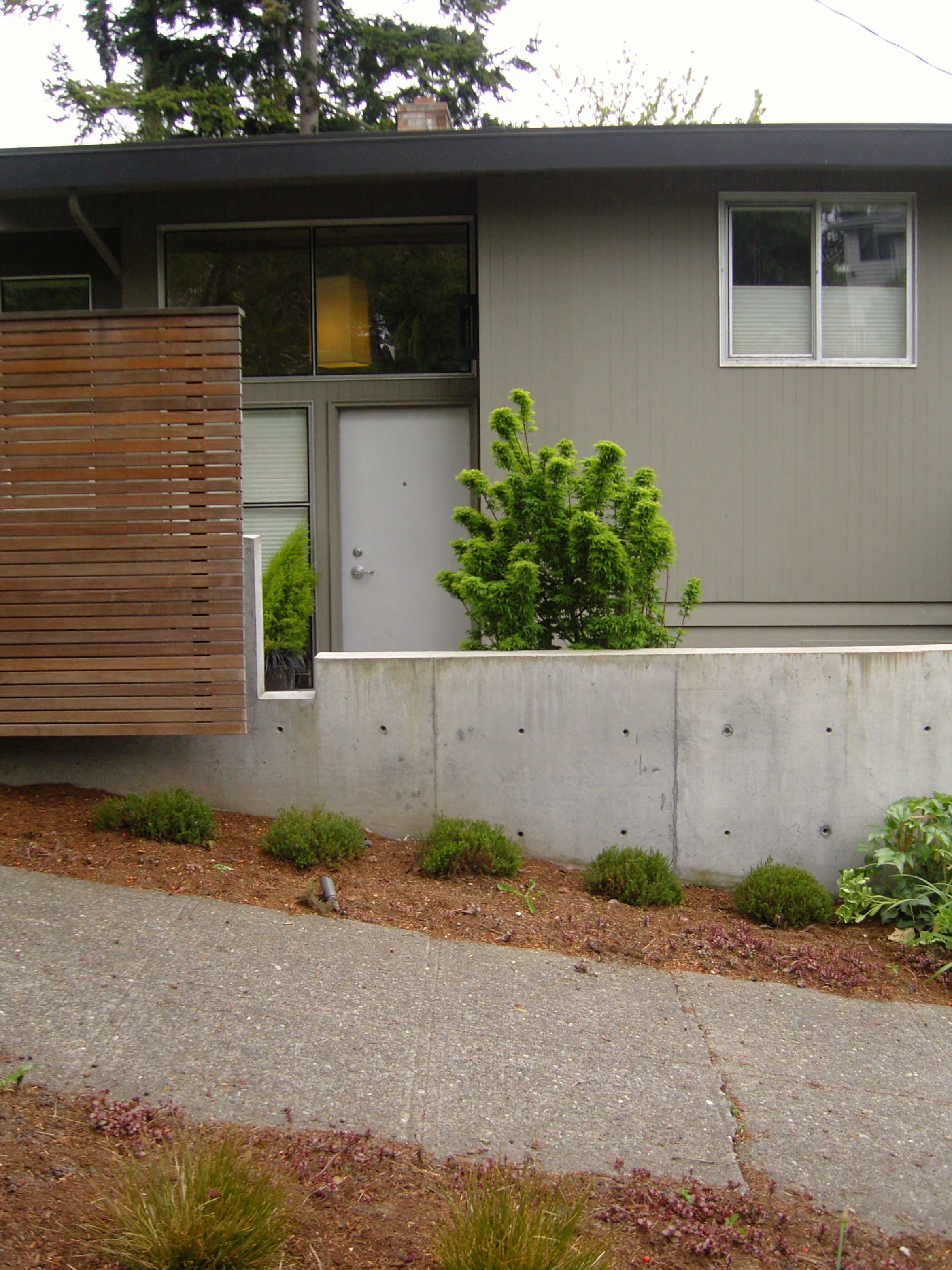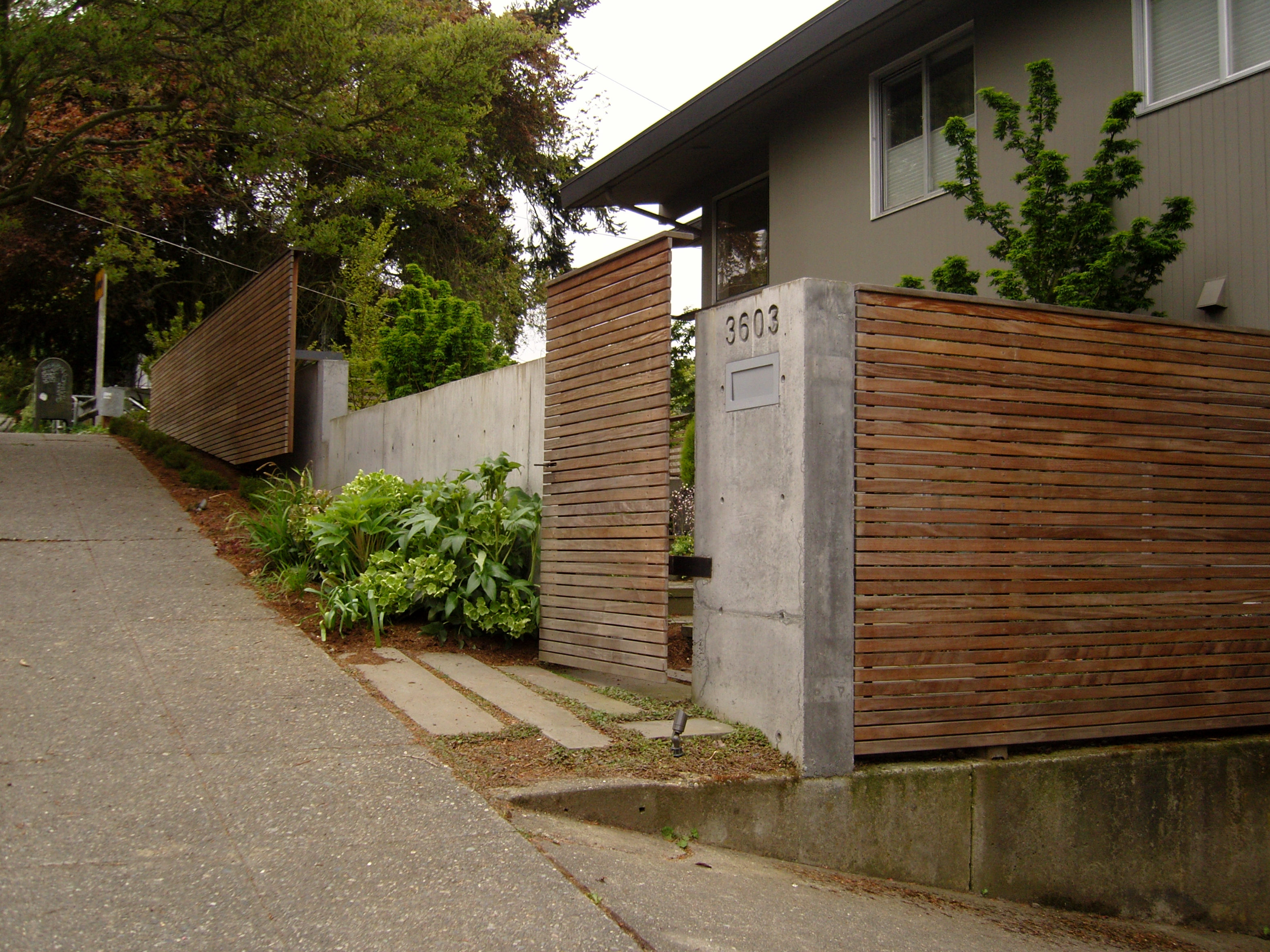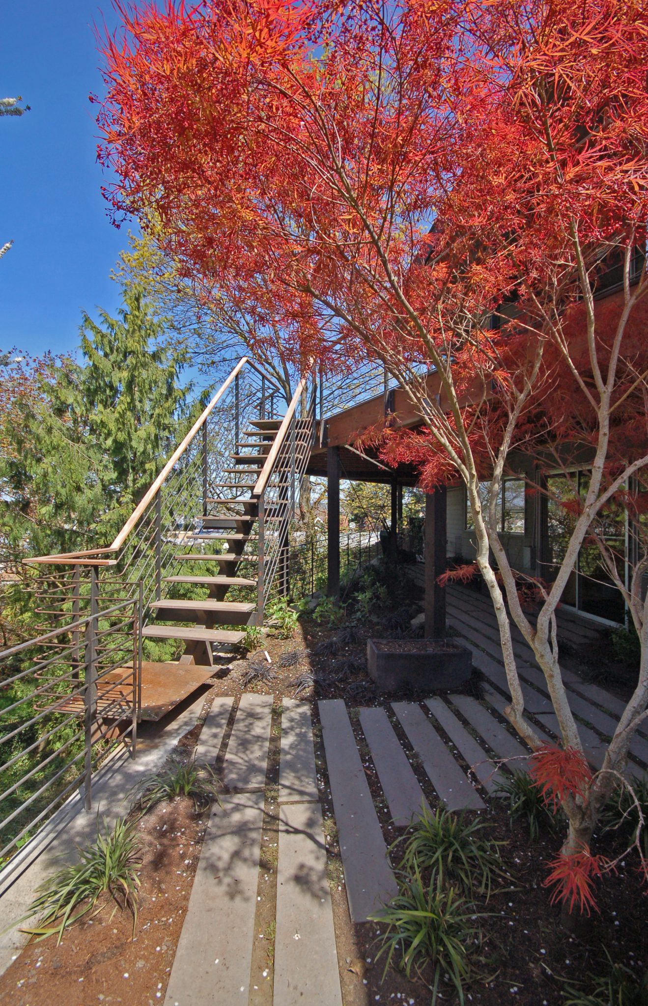 While this project focused purely on exterior elements, it completely transforms the relationship of the this dwelling to its surroundings landscape and give a whole new polished appearance to the somewhat undistinguished form of the existing house. Our work included a site wall/fence creating an interior courtyard entry and new deck and stair to the rear of the house which provided views and outdoor space off the living areas. Stairs from the deck connect inhabitants to the terraced back yard and provide a covered outdoor space for the lower level of the house.