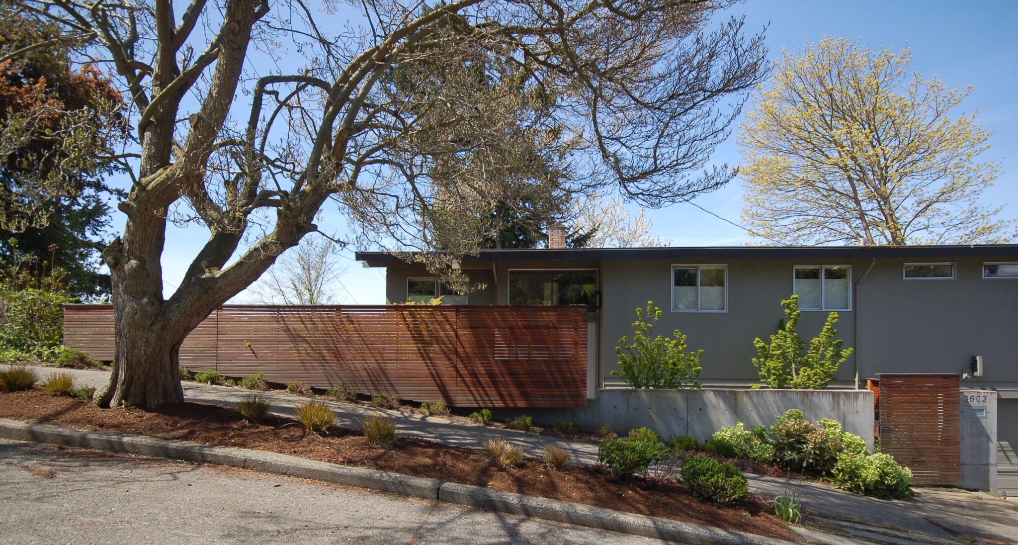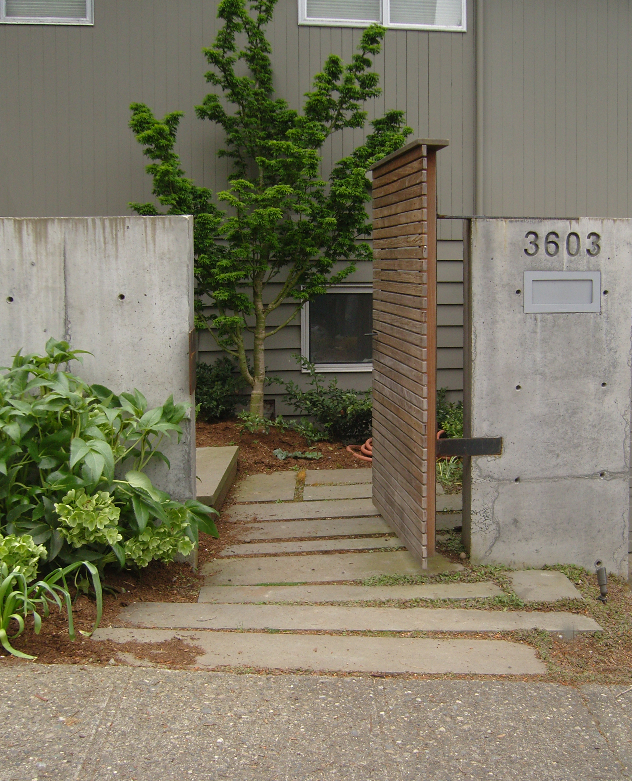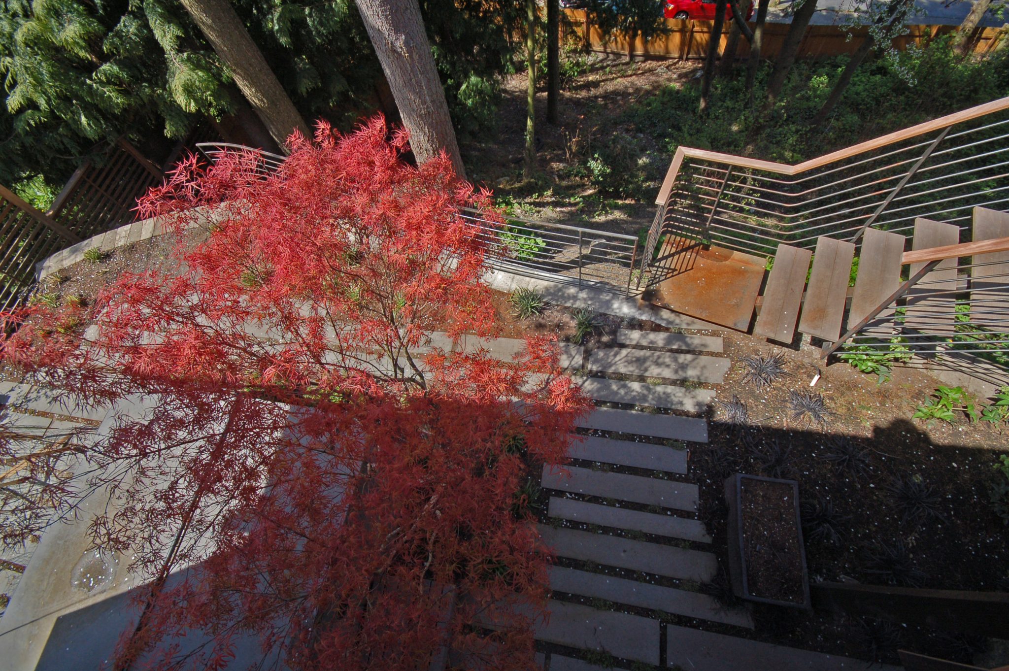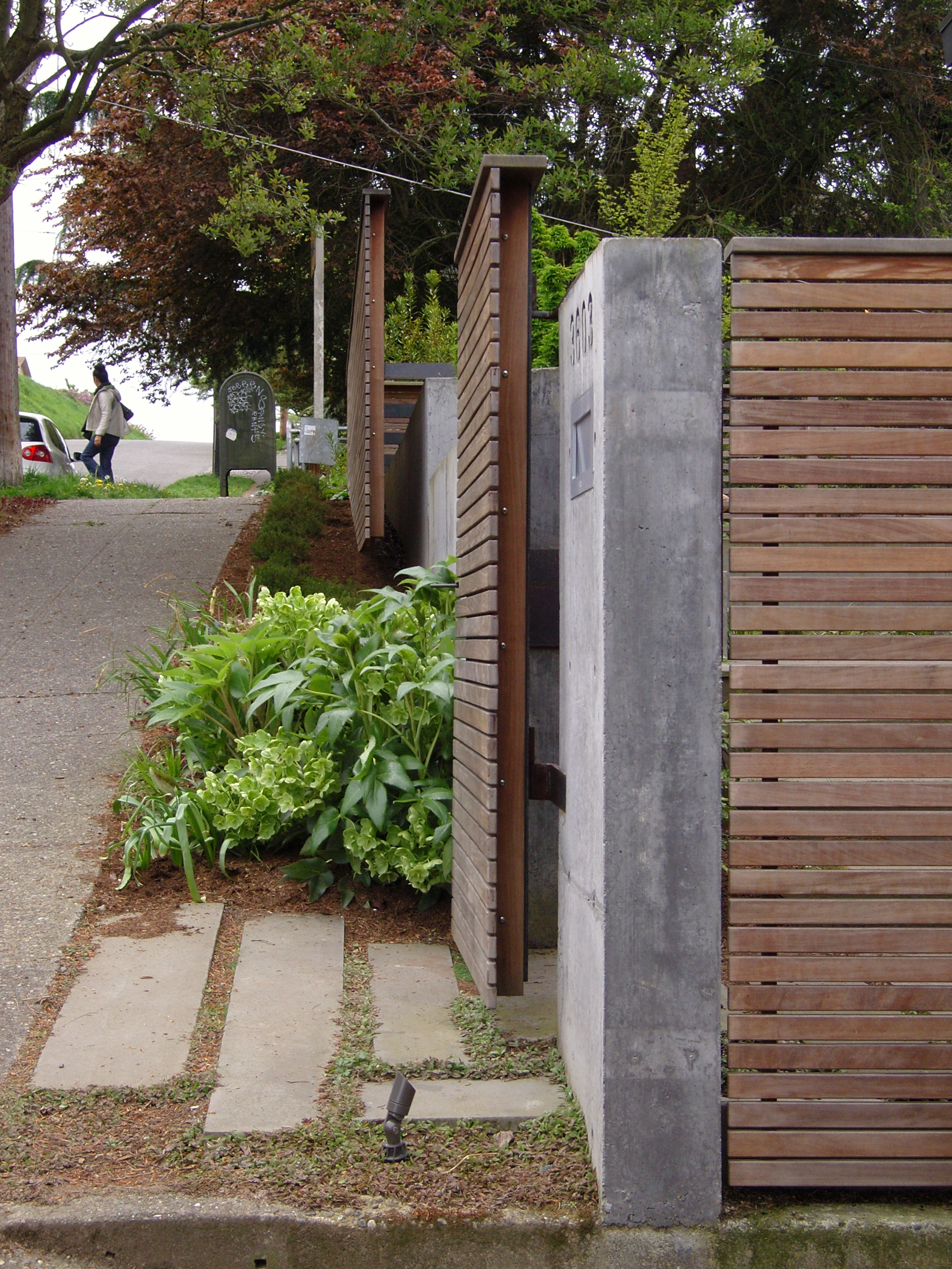 While this project focused purely on exterior elements, it completely transforms the relationship of the this dwelling to its surroundings landscape and give a whole new polished appearance to the somewhat undistinguished form of the existing house. Our work included a site wall/fence creating an interior courtyard entry and new deck and stair to the rear of the house which provided views and outdoor space off the living areas. Stairs from the deck connect inhabitants to the terraced back yard and provide a covered outdoor space for the lower level of the house.